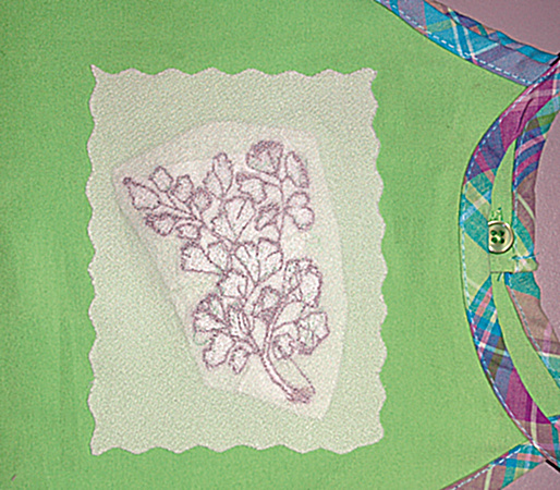 Ukryty w osłonie klej pod wpływem ciepła z żelazka, spaja osłonę z haftem.