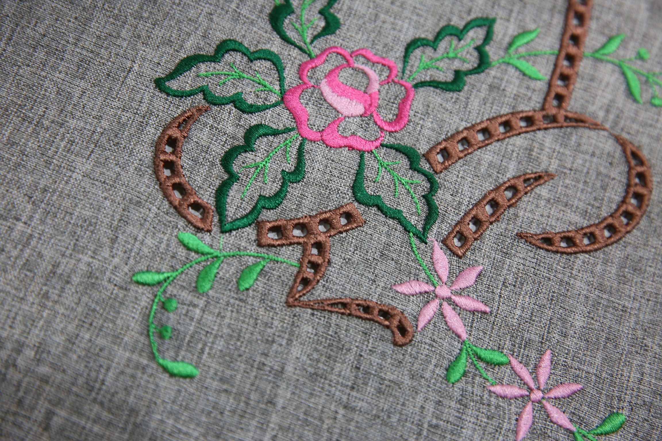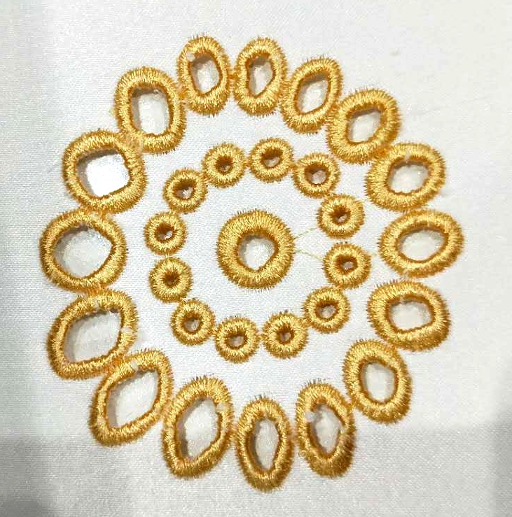 W łatwy sposób można przygotować jedną z igielnic do wycinania w materiale. Po wykonaniu wycinania sugerujemy zatrzymać haft i wyczyścić urządzenie z resztek wyciętego materiału. W następnym kroku przykrywamy otwory flizeliną rozpuszczalną lub hydrofolią o grubości 80um, aby umożliwić hafciarce dekoracyjne obszycie otworów.